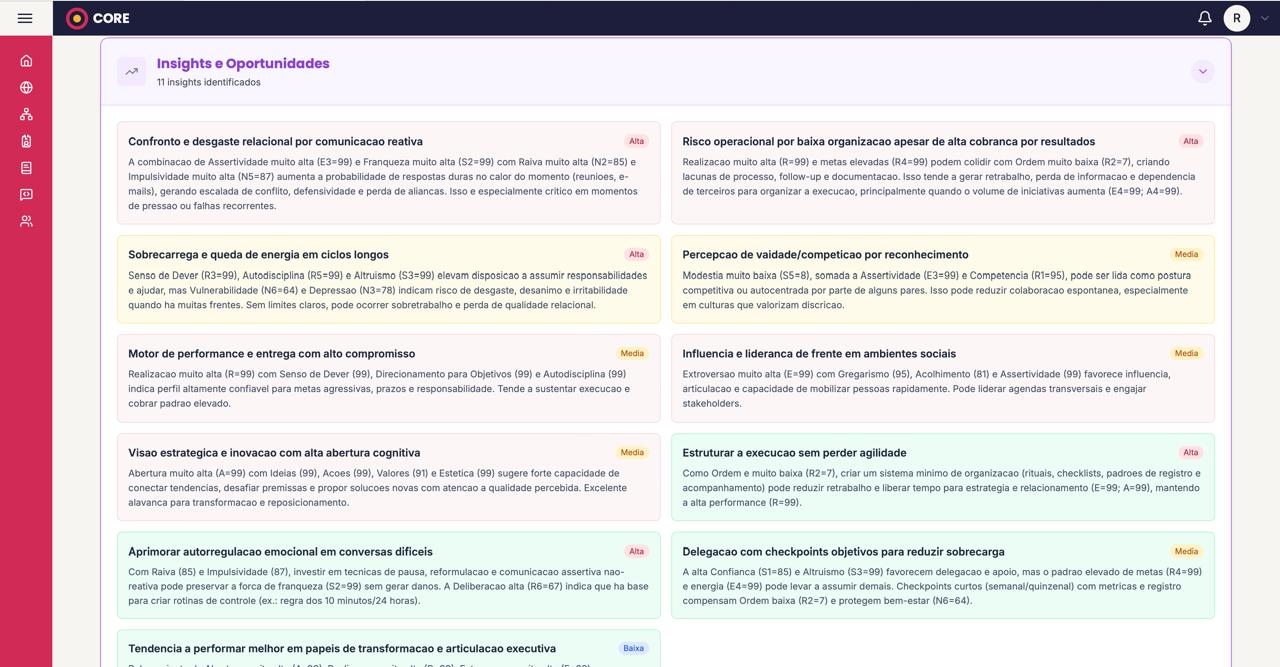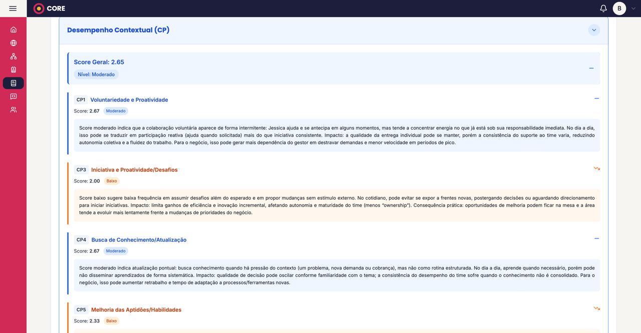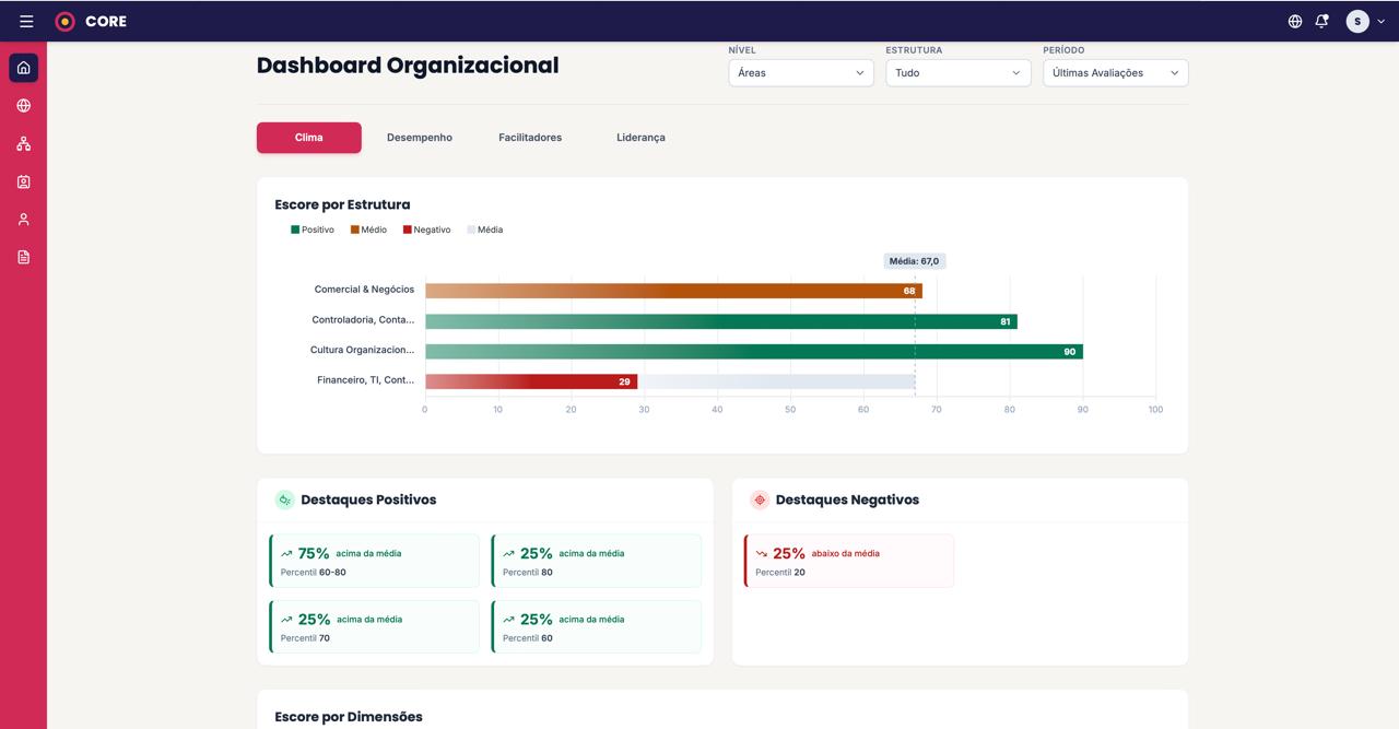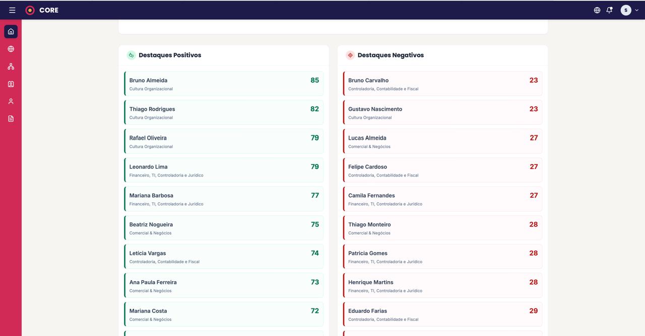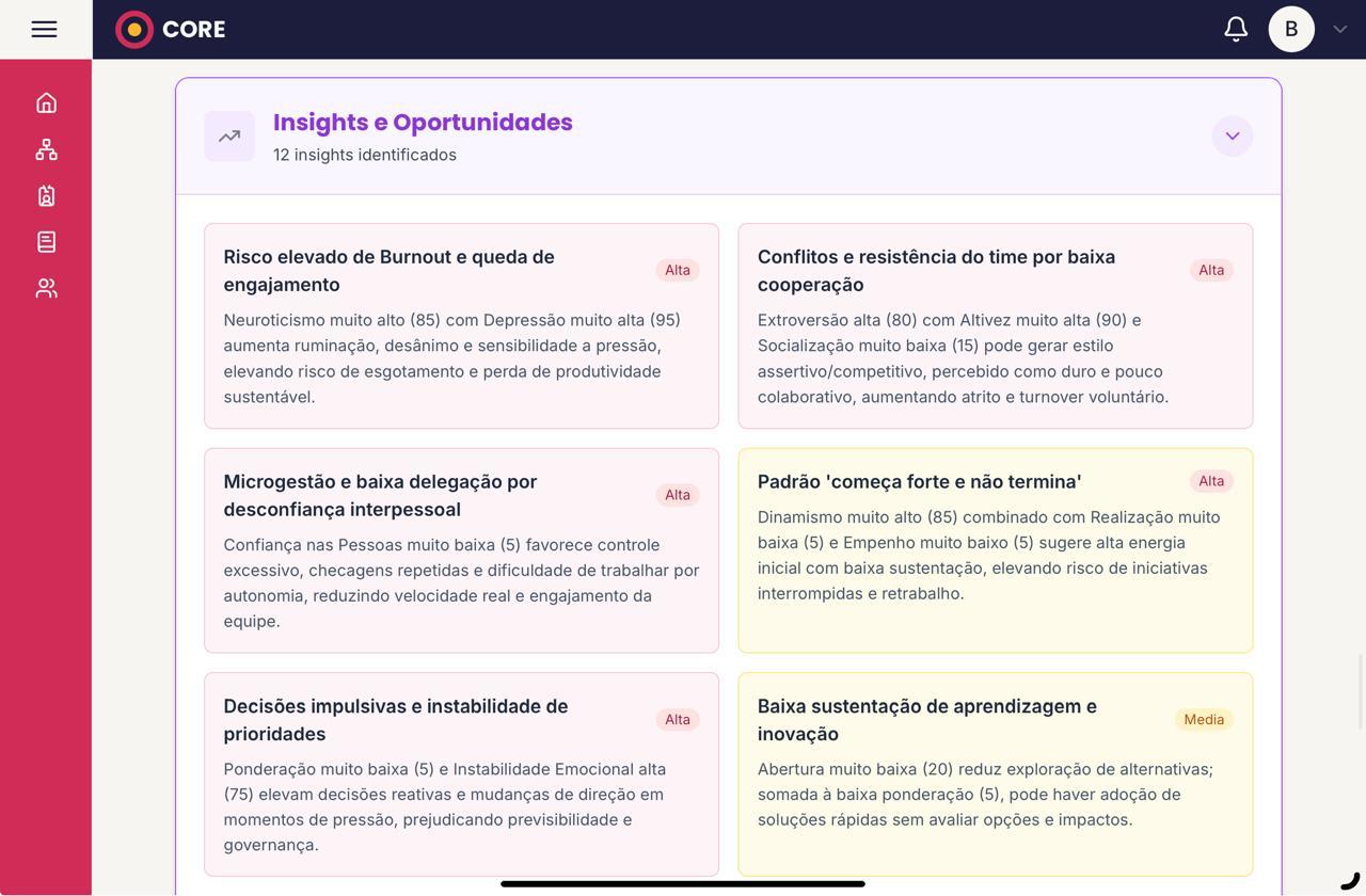 A CORE traduz comportamentos complexos em diagnósticos executivos claros. Avalie o desempenho, tenha uma estrutura viva e preveja riscos organizacionais em uma única plataforma.