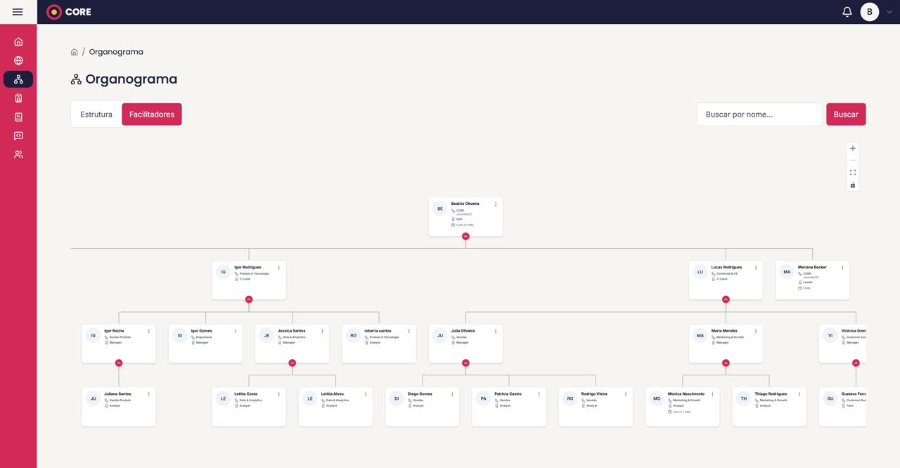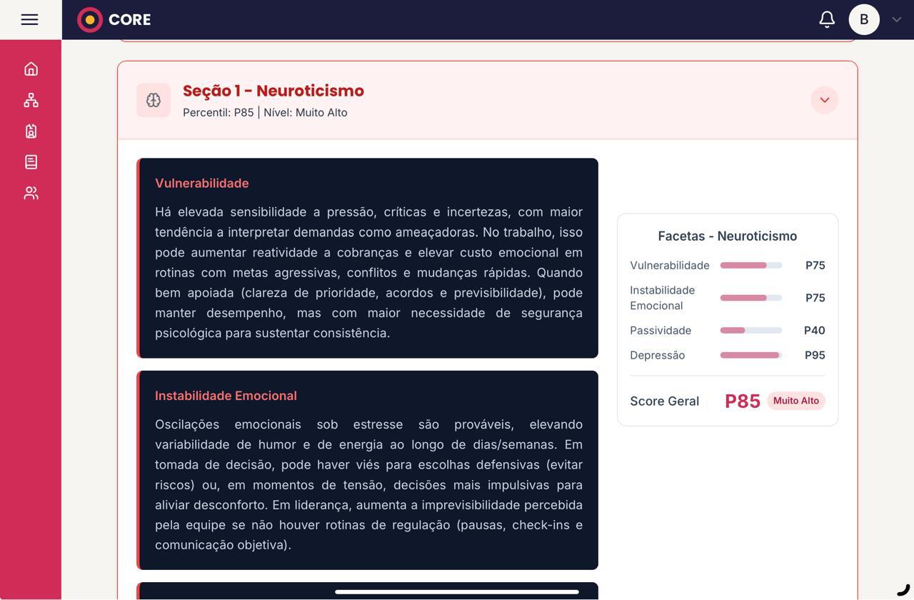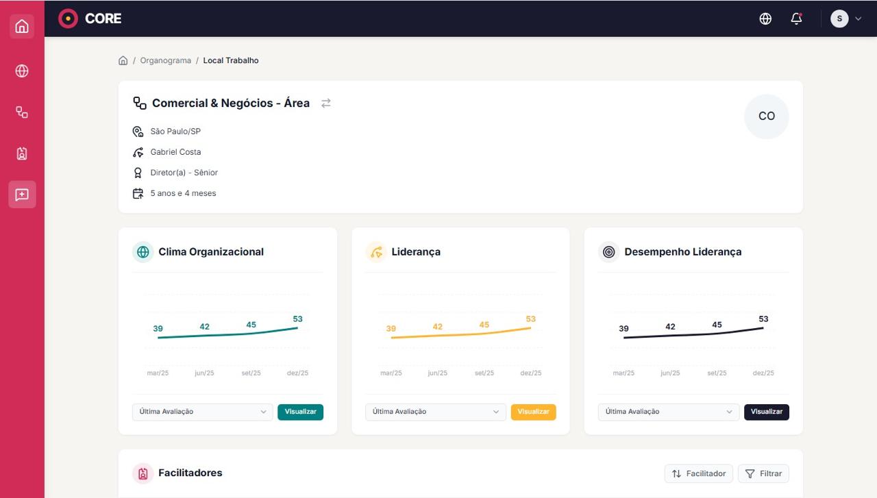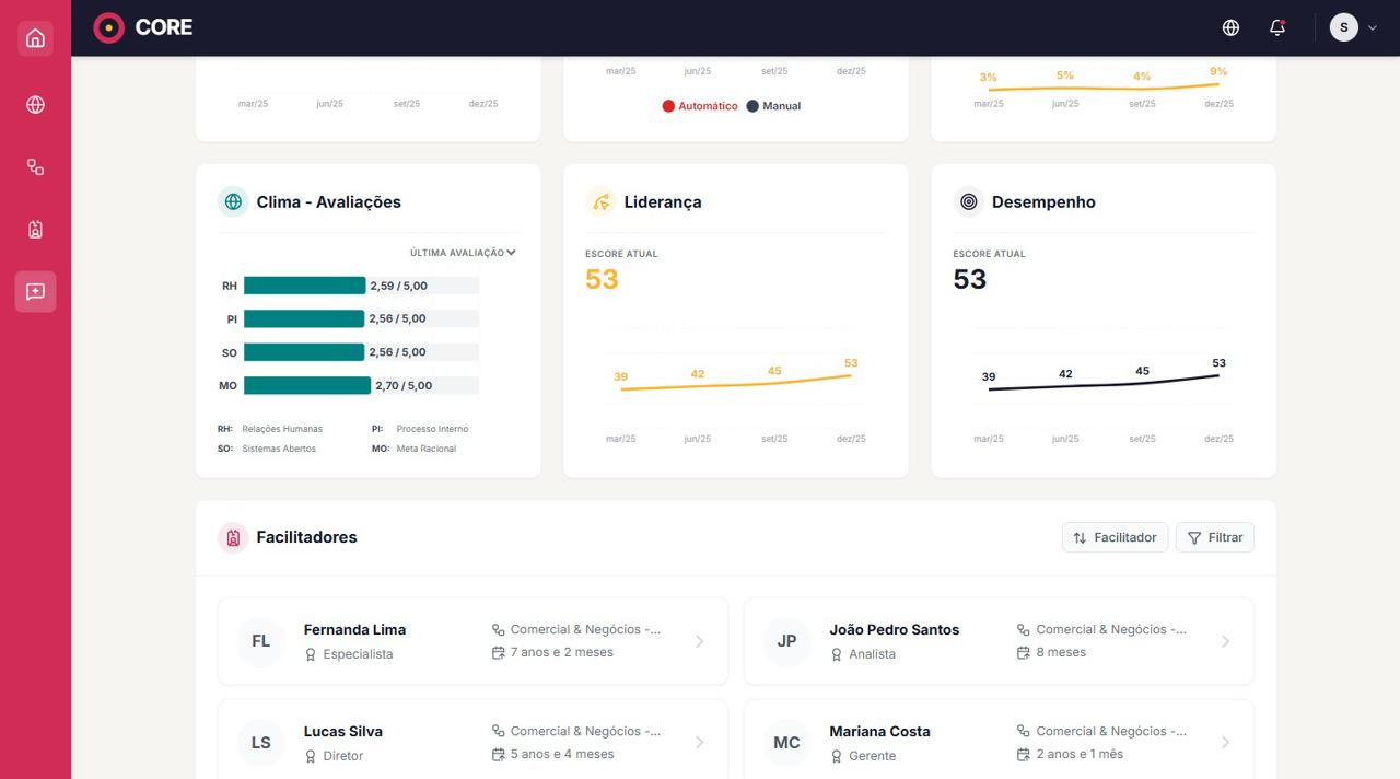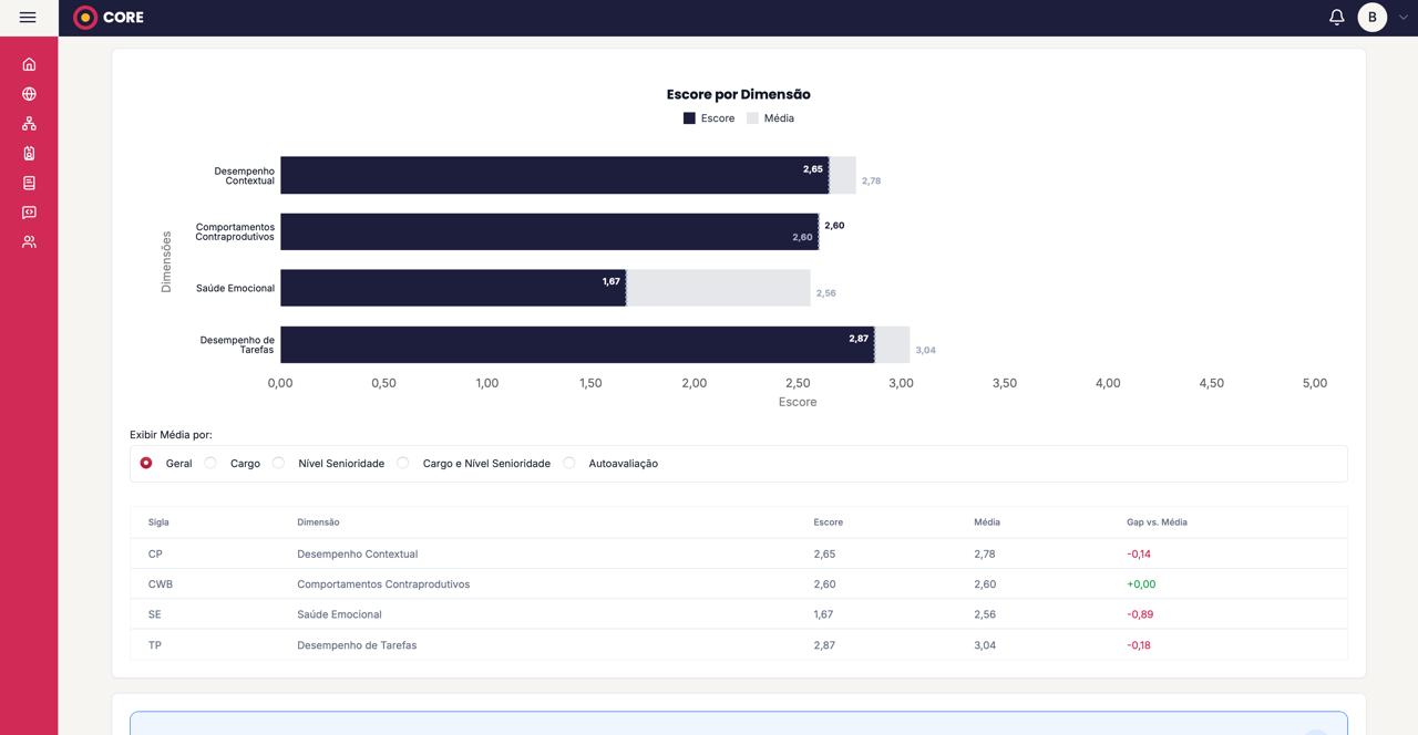 A CORE traduz comportamentos complexos em diagnósticos executivos claros. Avalie o desempenho, tenha uma estrutura viva e preveja riscos organizacionais em uma única plataforma.