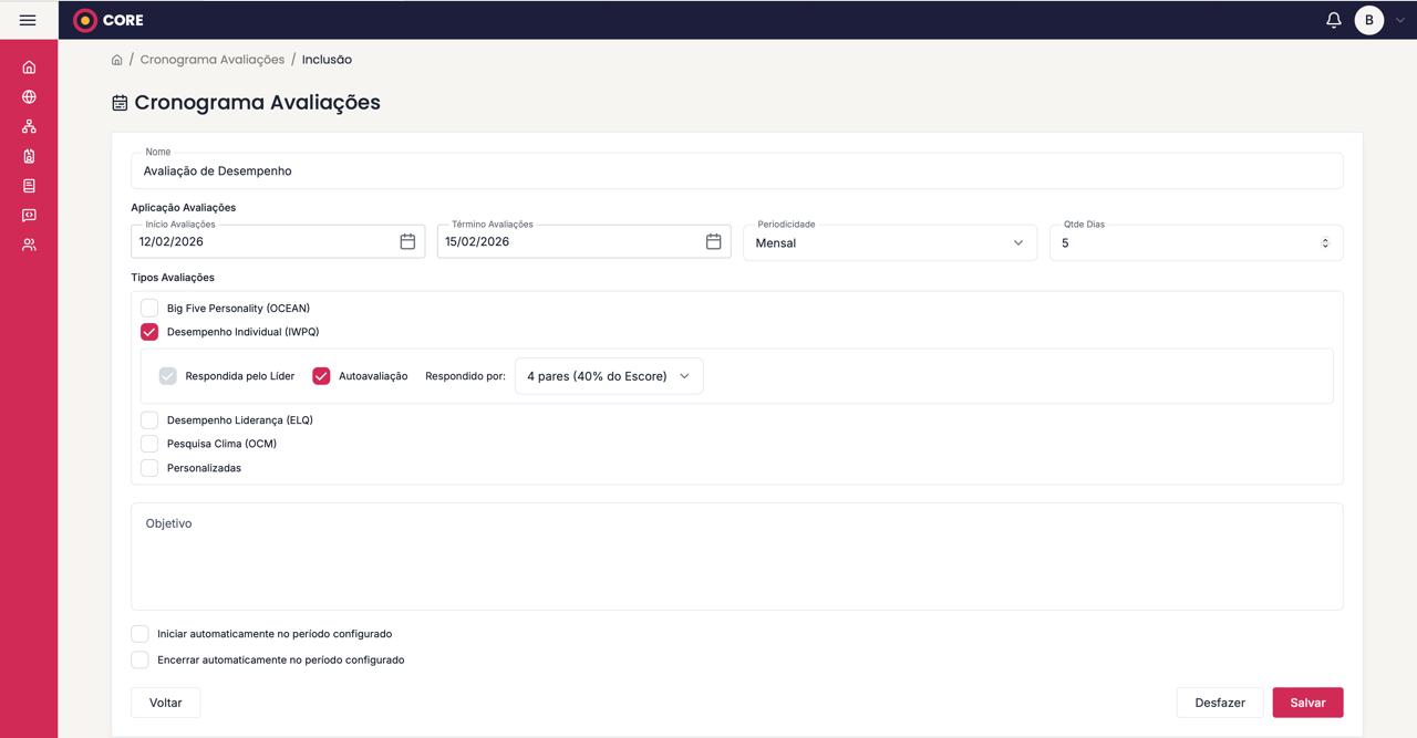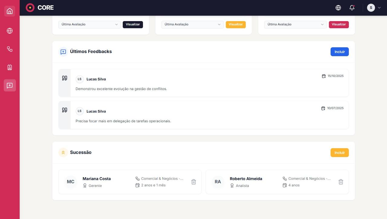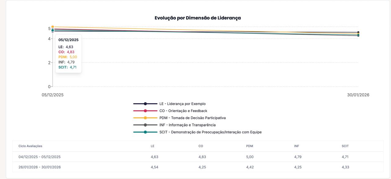 O sistema identifica automaticamente os líderes da estrutura e aplica avaliações específicas de liderança, com modelos prontos ou personalizados.
