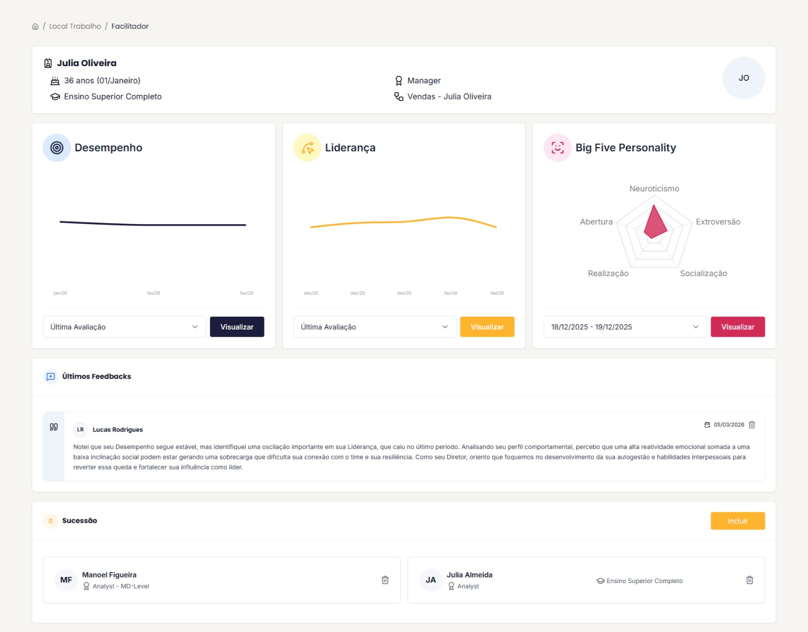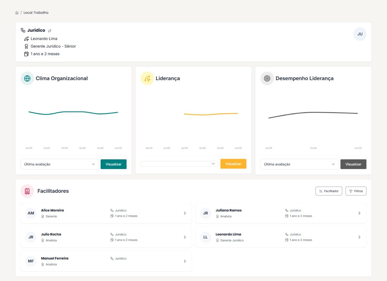 É possível direcionar a avaliação para toda a empresa, setores específicos ou equipes determinadas, garantindo diagnósticos precisos sobre gestão, influência e capacidade de condução de times.